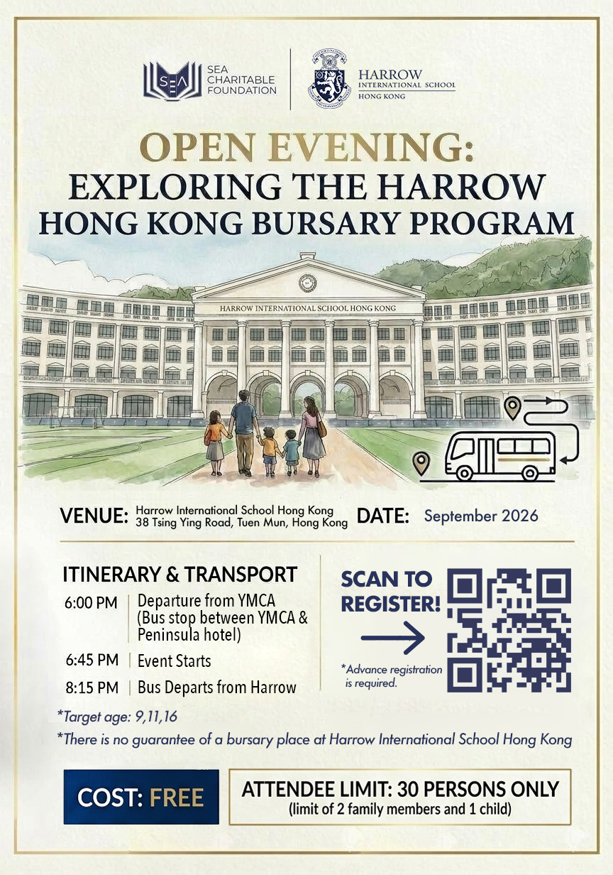 We are pleased to invite our NGO partners to the SEA Charitable Foundation x Harrow International School Hong Kong Open Evening, where we will be exploring the Harrow Hong Kong Bursary Program.